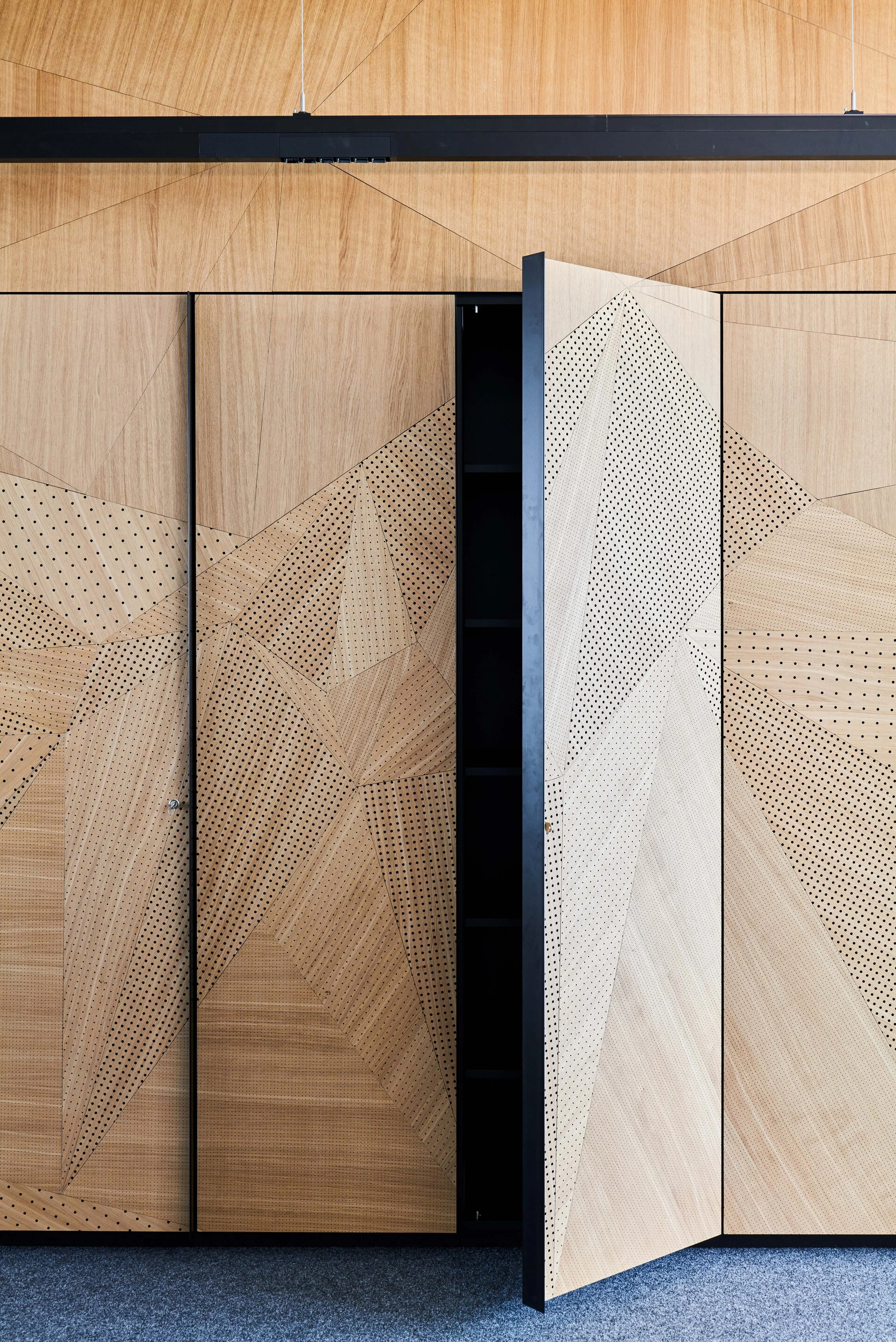 In den Büroräumen von Autodesk zieht sich handwerkliche Präzision durch jedes Detail. Die Wandverkleidungen aus Eichenholz wurden nach Mustervorgabe gefräst und mit einem schwarzen Untergrund versehen. Sie verlaufen über zwei Etagen und prägen das gesamte Raumgefühl.
