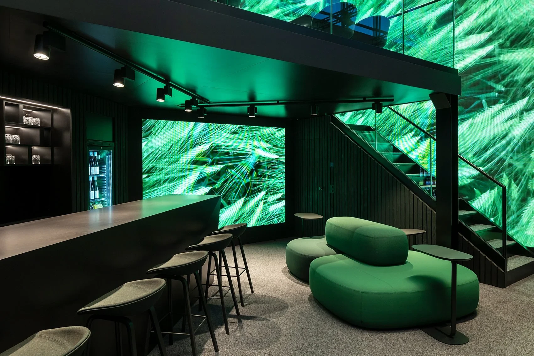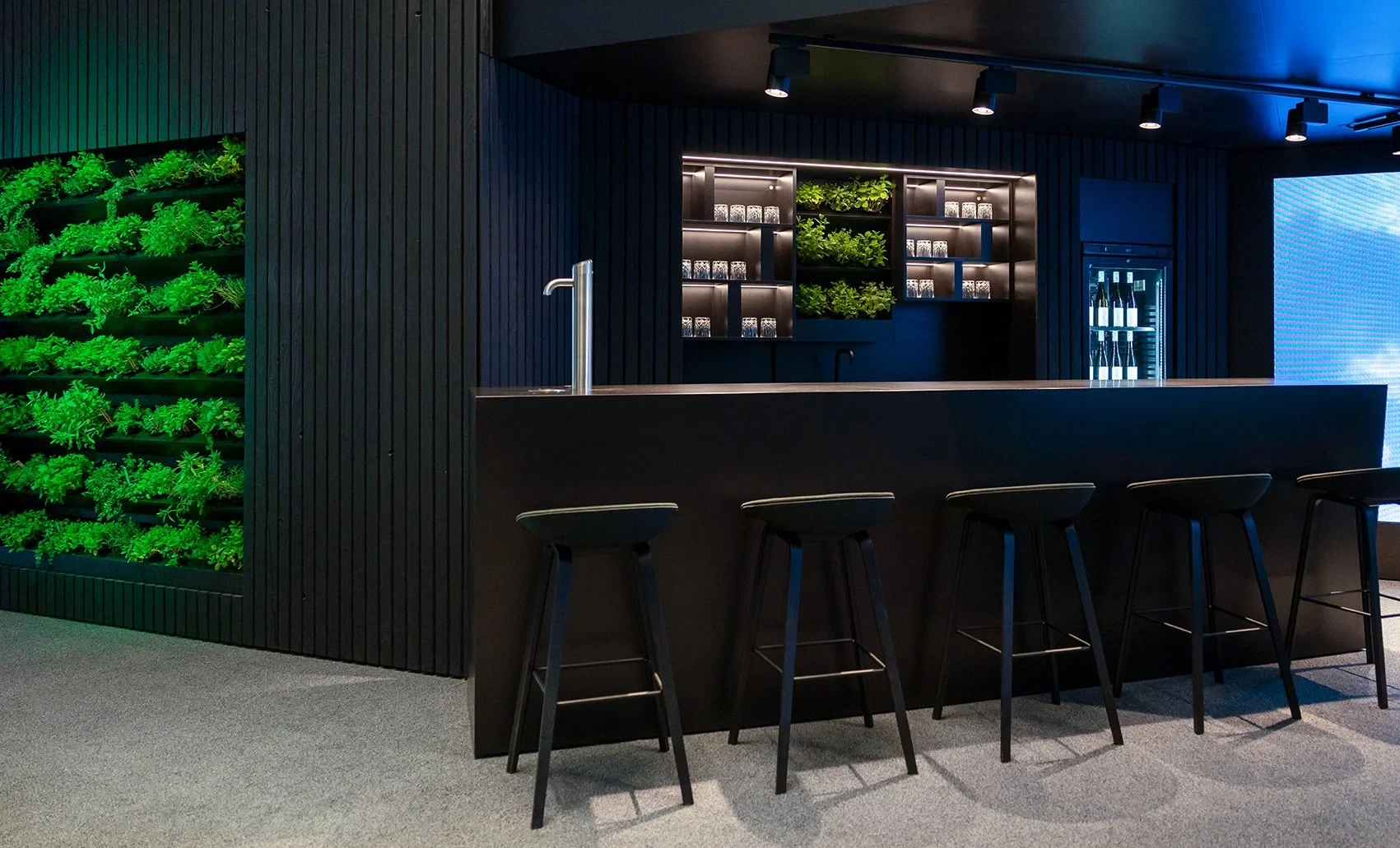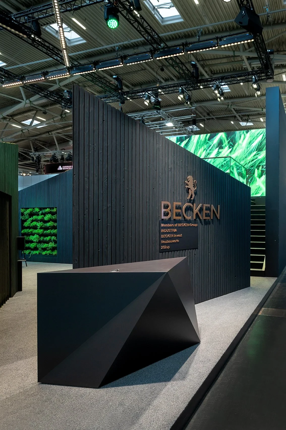 Für Becken entwickelte und fertigte Brunold Interior einen vollständig nachhaltigen Messestand – von der technischen Planung bis zur Produktion sämtlicher Bauteile. Stahlkonstruktion, LED-Wände, Vorhänge, Boden, Bricks, Möbel und Wasserspender stammen komplett aus eigener Hand.