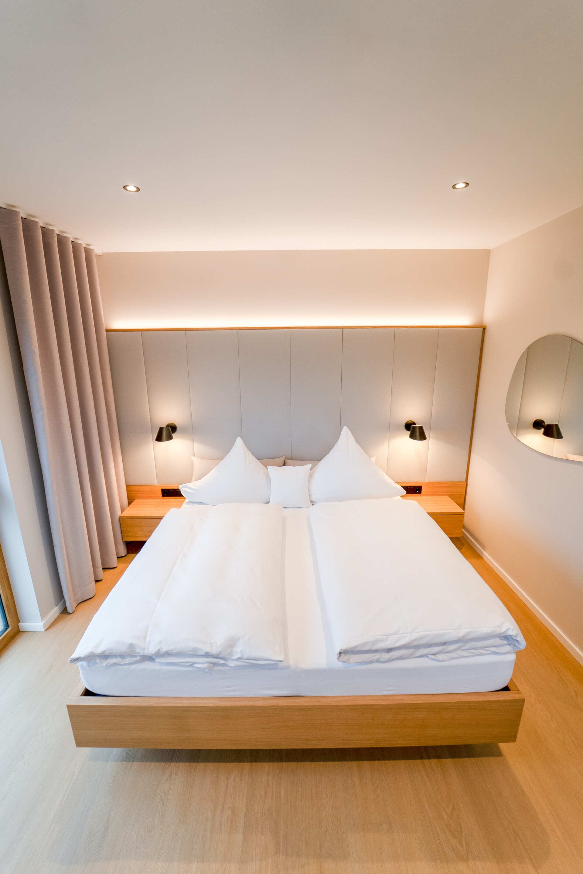 Von maßgefertigten Betten über funktionale und stilvolle Badezimmermöbel bis hin zu Vorhängen, Bodenbelägen und individuell gefertigten Möbelstücken wie Tischen und Kleiderschränken wurde jedes Detail sorgfältig geplant und umgesetzt. Auch Türen und weitere Schreinerarbeiten fügen sich nahtlos in das Gesamtkonzept ein.