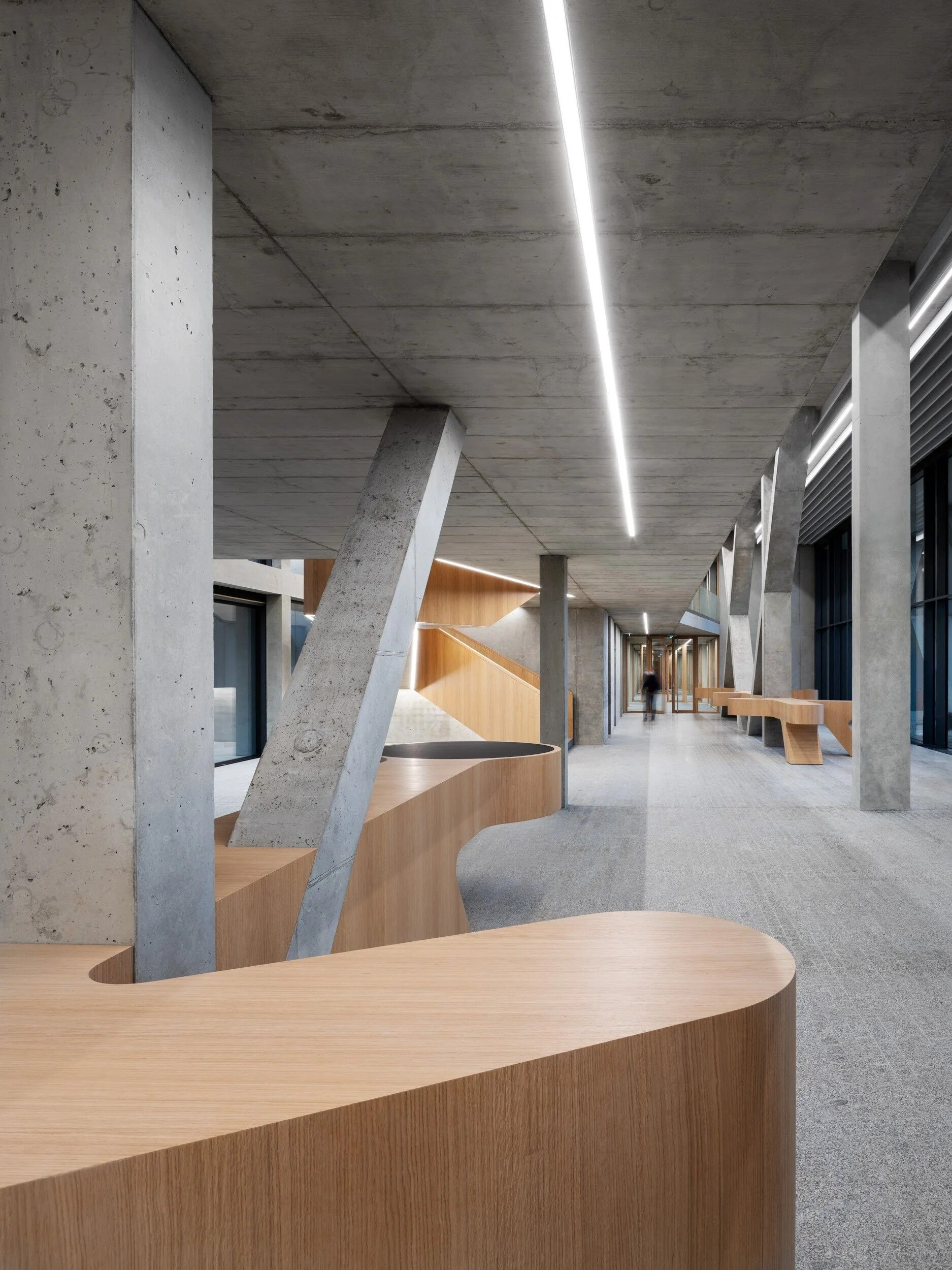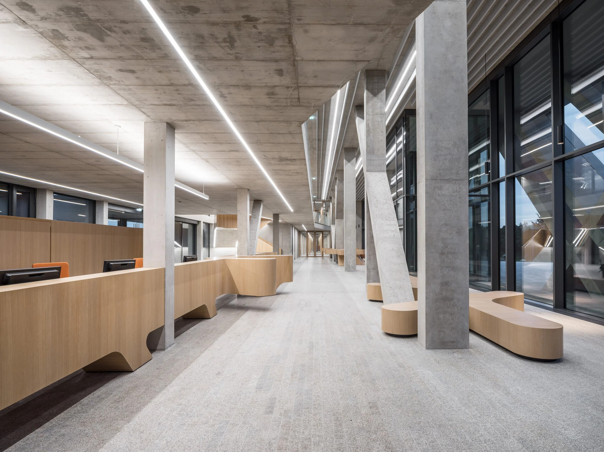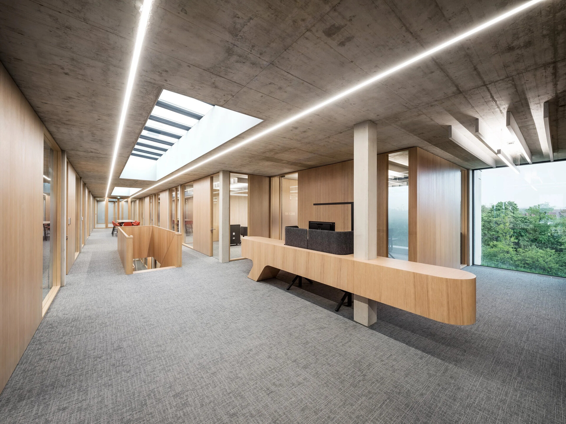 Für IGZ Falkenberg fertigte Brunold Interior sämtliche Sondermöbel in individueller Freiform. Die Oberflächen bestehen aus geseifter Eiche, fugenlos ausgeführt und im Inneren durch eine präzise Stahlkonstruktion getragen.