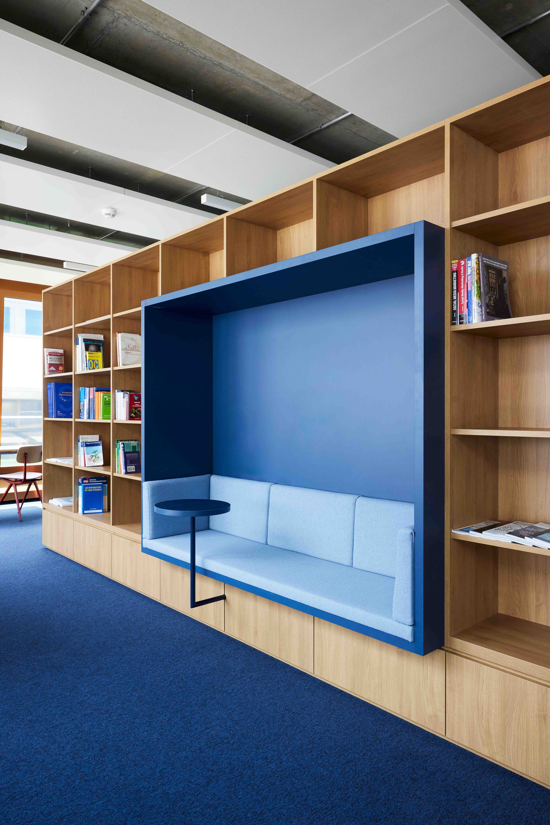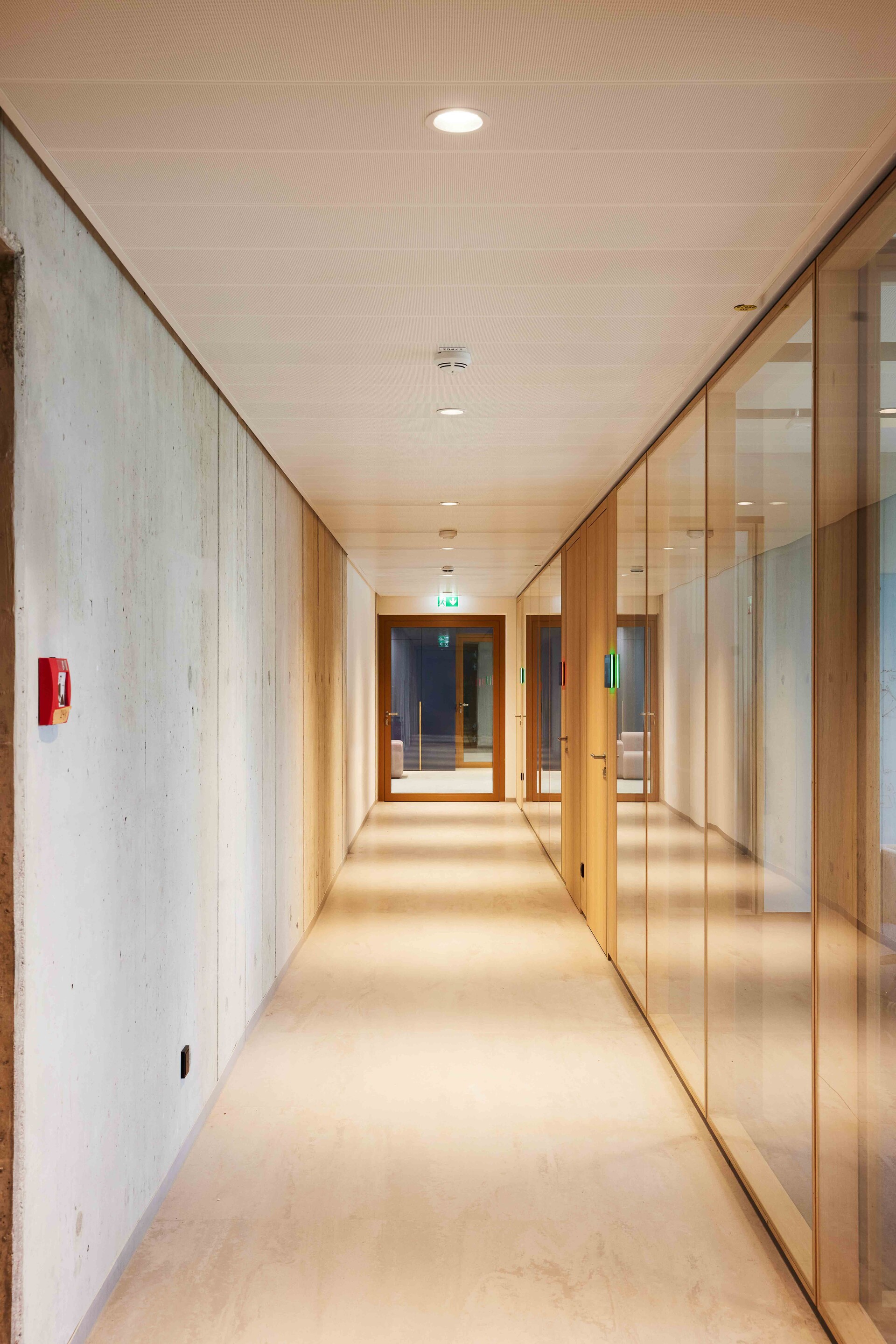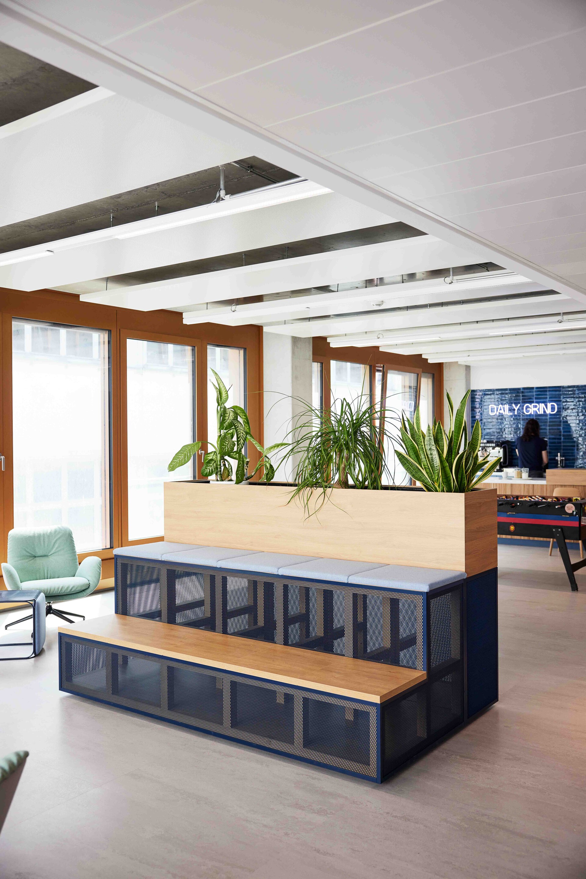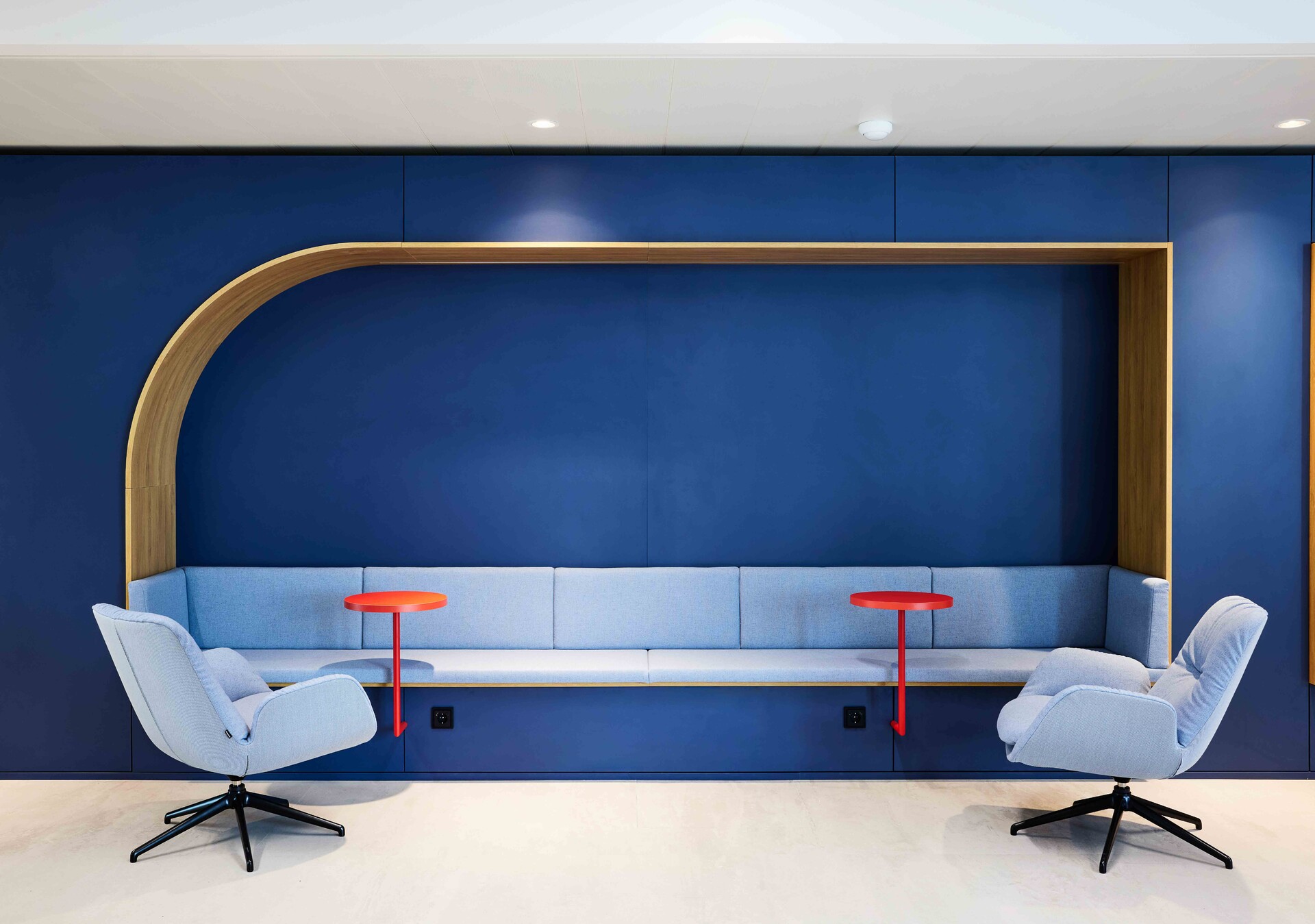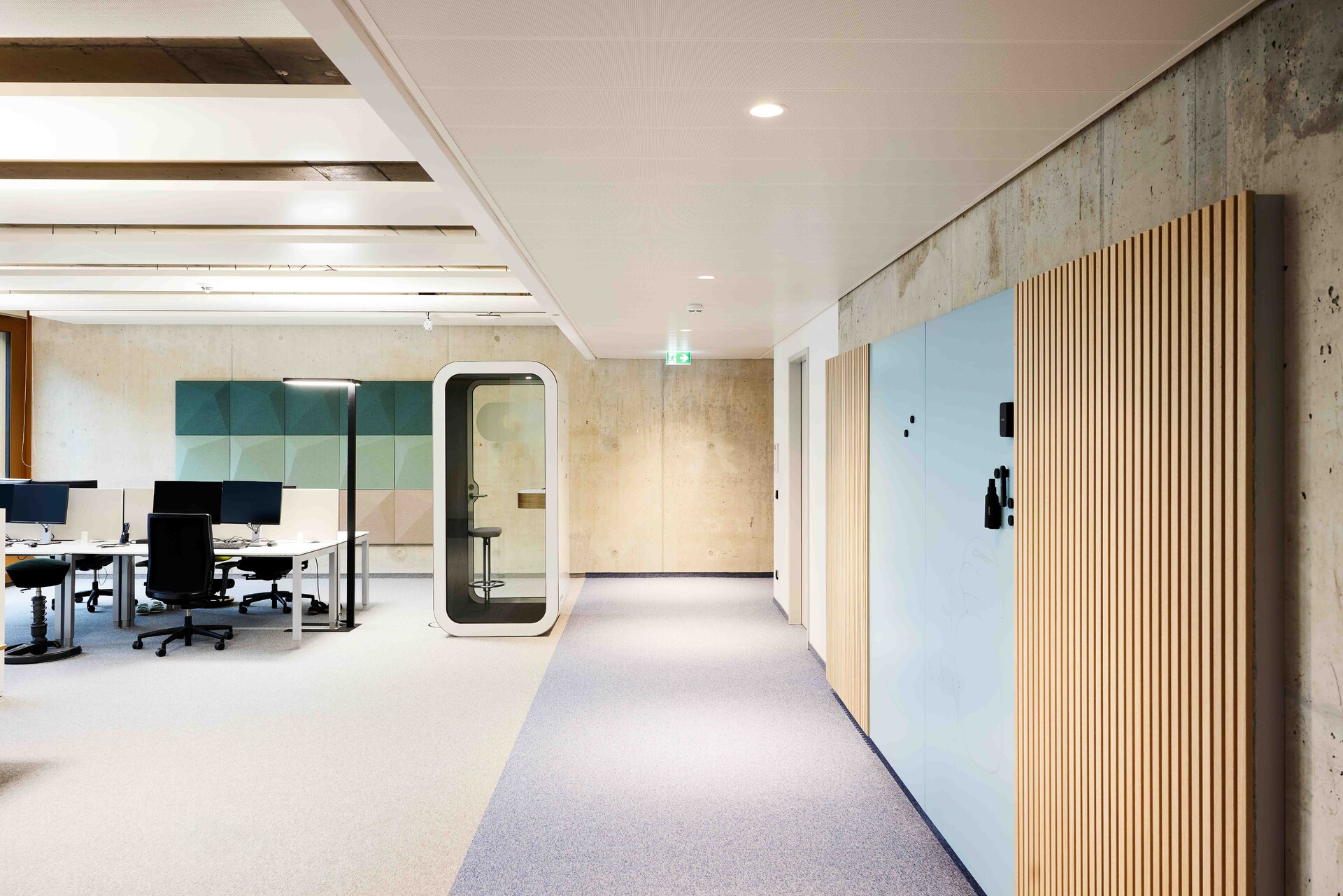 Besonderes Highlight ist die elegant geschwungene Empfangswand aus Eiche, die mit einer integrierten Polstersitzbank und offenen Regalelementen einen harmonischen Mittelpunkt schafft.