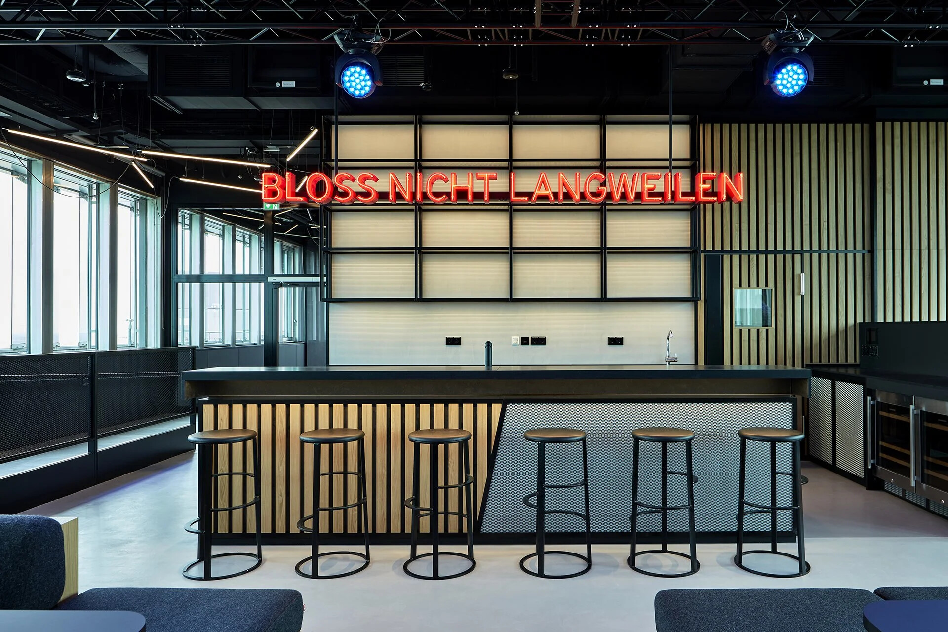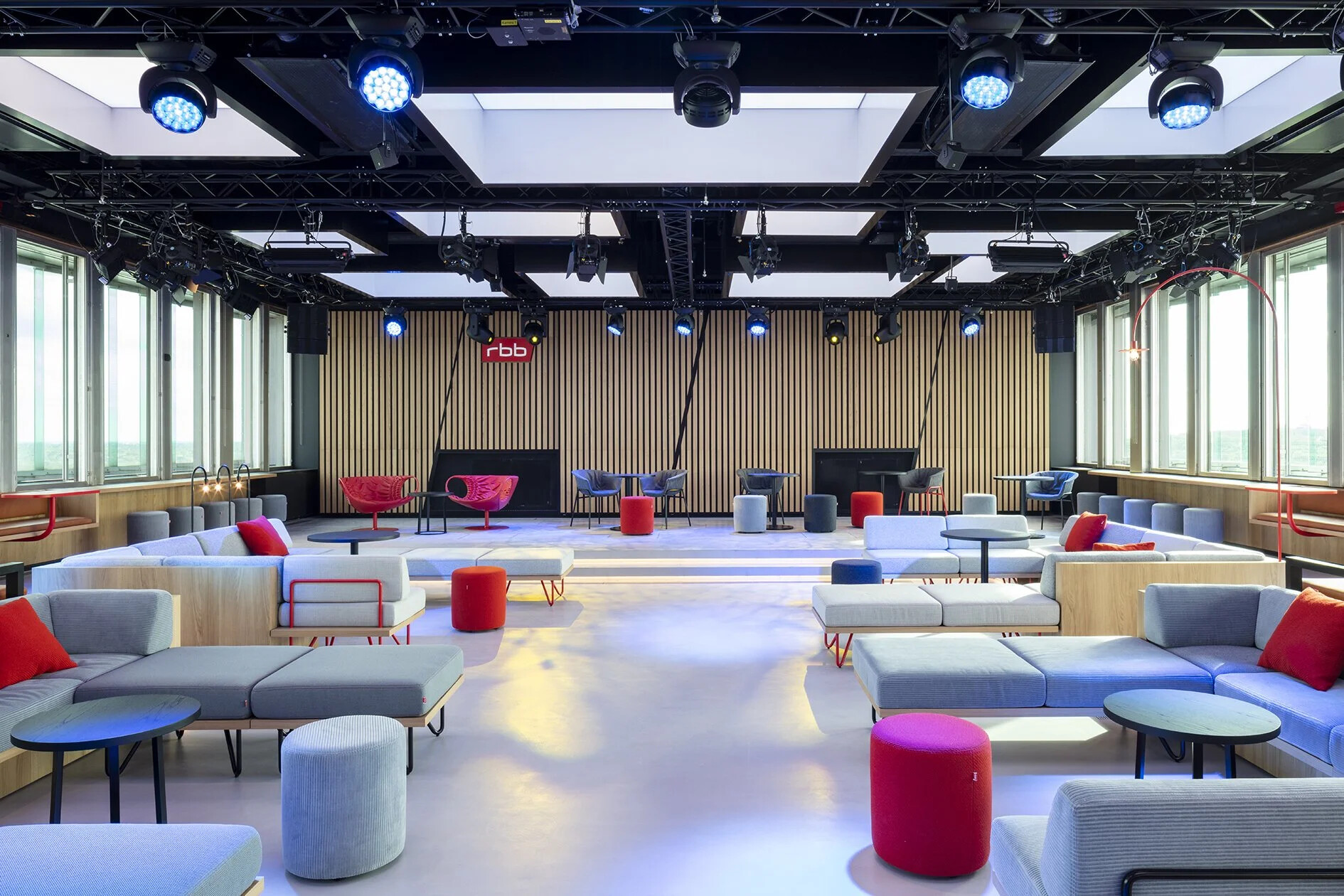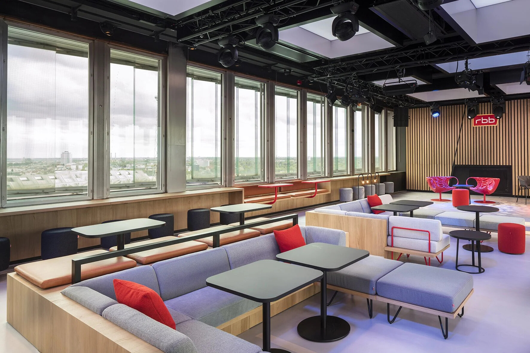Für das RBB-Studio 14 übernahm Brunold Interior den gesamten Innenausbau. Sitzbänke mit Polstern, Streckmetallelemente, Lamellenverkleidungen, Metallarbeiten und sämtliche Möbel wurden in eigener Werkstatt gefertigt. Auch der markante Leuchtschriftzug stammt von Brunold.