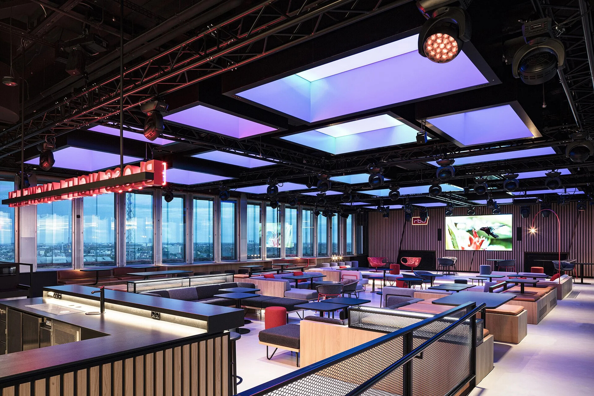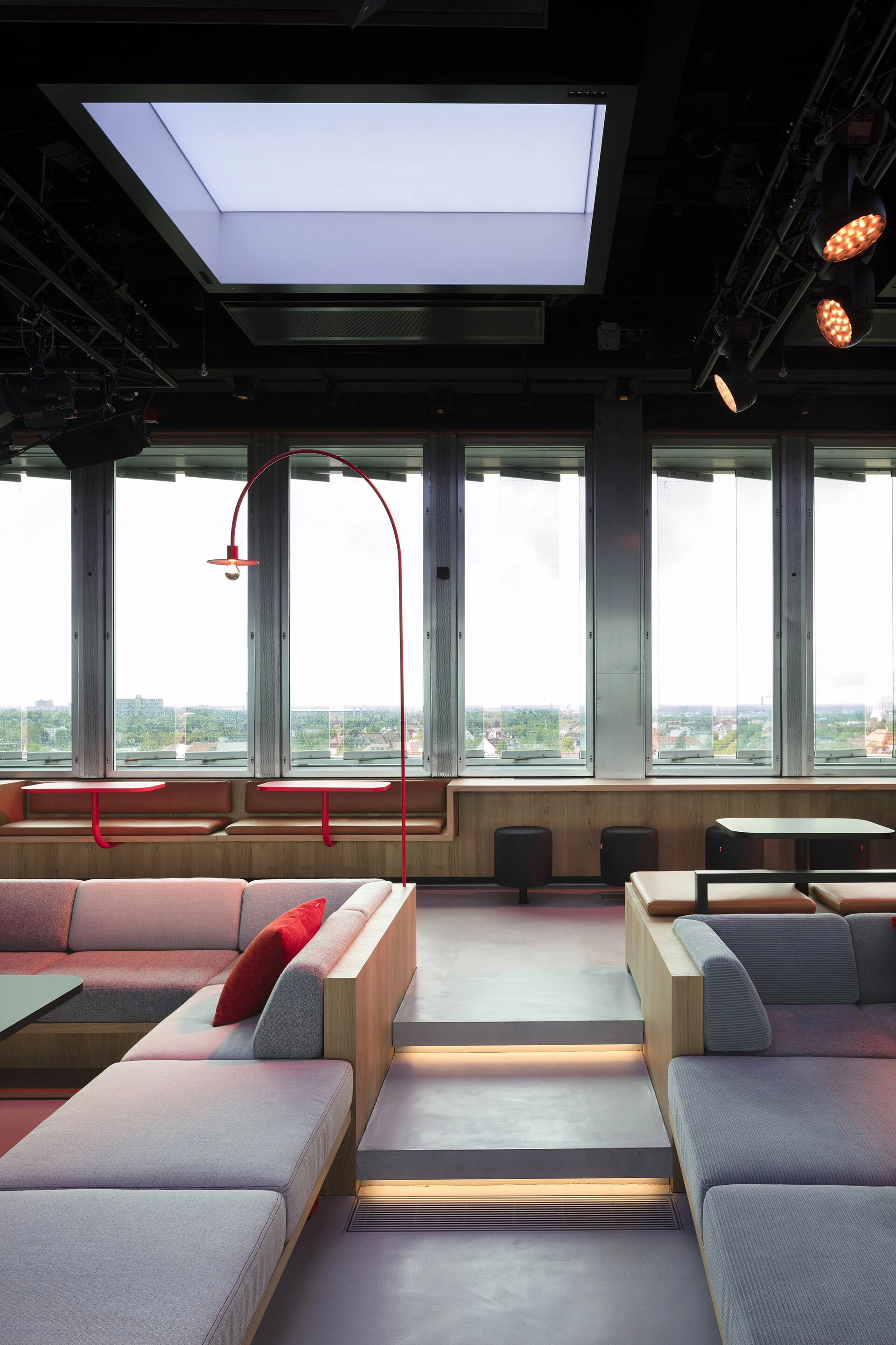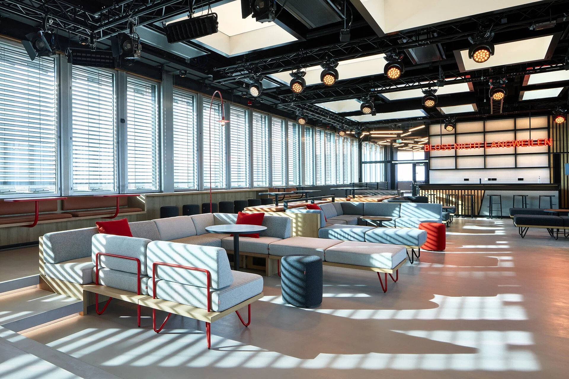 Für das RBB-Studio 14 übernahm Brunold Interior den gesamten Innenausbau. Sitzbänke mit Polstern, Streckmetallelemente, Lamellenverkleidungen, Metallarbeiten und sämtliche Möbel wurden in eigener Werkstatt gefertigt. Auch der markante Leuchtschriftzug stammt von Brunold.